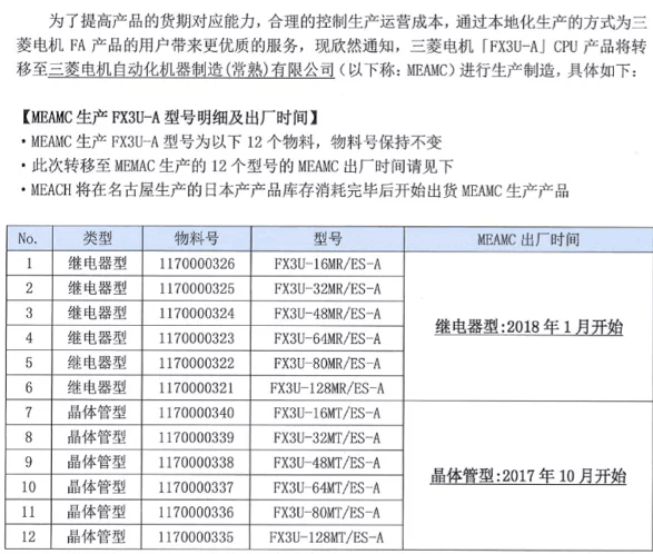 FX3U-***/ES-A 系列產(chǎn)品是三菱FX系列最重要的產(chǎn)品,目前各代理商收到通知,三菱將把此產(chǎn)品更換到三菱常熟工廠(chǎng)生產(chǎn)
