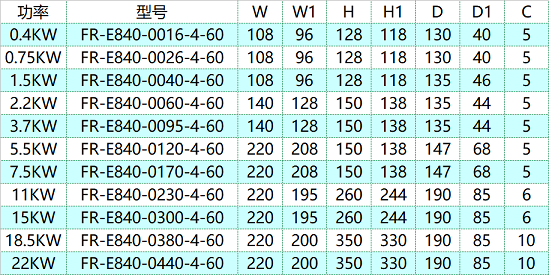 FR-E840-0440-4-60 | 22KW,額定44A,3相380V輸入 |