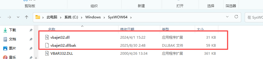 C:\Windows\SysWOW64\vbajet32.dll拒絕訪(fǎng)問(wèn),接著(zhù)百度搜了一下,發(fā)現是win11系統更新時(shí)把這個(gè)dll文件更新了,于是我想著(zhù)替換掉這個(gè)文件回老版本行不行呢,于是就試了一下,結果發(fā)現是可以的。