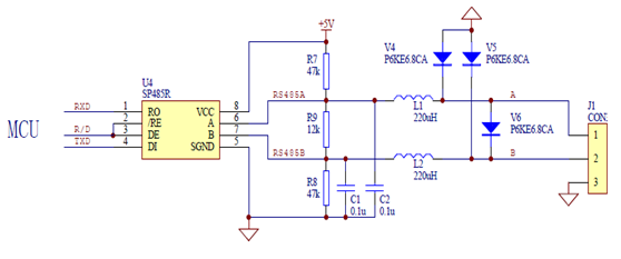 連接至A 引腳的上拉電阻R7、連接至B 引腳的下拉電阻R8 用于保證無(wú)連接的SP485R芯片處于空閑狀態(tài),提供網(wǎng)絡(luò )失效保護,以提高RS-485 節點(diǎn)與網(wǎng)絡(luò )的可靠性。
