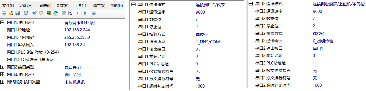 智能網(wǎng)關(guān)的串口1接歐姆龍PLC,串口2接觸摸屏;通過(guò)網(wǎng)口對接西門(mén)子S7-1500的PLC(IP地址:192.168.2.111)。打開(kāi)智能網(wǎng)關(guān)的參數設置軟件(軟件下載),先設置智能網(wǎng)關(guān)模塊的網(wǎng)口和串口參數,設置好的參數如下圖: