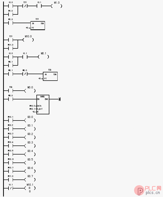 M10.0為數據輸入端DATA ,根據控制要求,每次只有一個(gè)輸出,因此只需要在第一個(gè)移位脈沖到來(lái)時(shí)由M10.0送入移位寄存器S-BIT位(M10.1)一個(gè)“1”