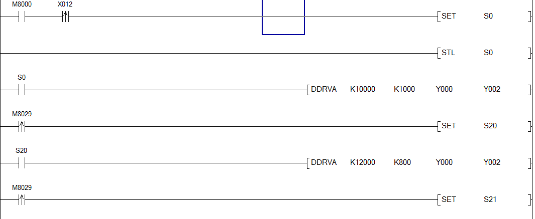 隨便寫(xiě)了個(gè)程序,想測試下STL步進(jìn)指令下定位指令的功能,程序如上圖,功能是單一電機多段速,第一段能夠執行,但是第二段定位指令就不動(dòng)作了,請各位高手指點(diǎn),謝謝!