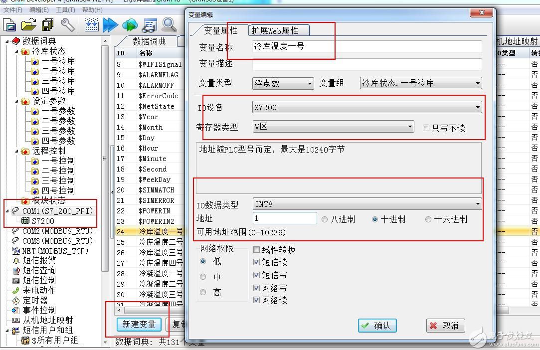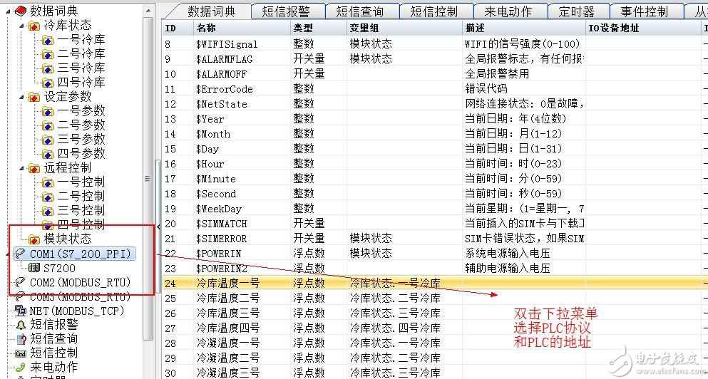 GRM500上有幾個(gè)串口,如PLC200上圖接的GRM500串口COM1(注意根據對應現場(chǎng)GRM500接那個(gè)COM口而設置),此時(shí)選擇COM1 調出西門(mén)子200PPI協(xié)議,在COM1右鍵添加PLC的地址(注意一個(gè)COM口可以接多臺PLC)如上圖。