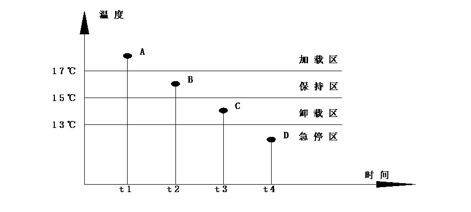 在t2之后的下一時(shí)刻,若檢測到溫度處于卸載區時(shí)(如t3時(shí)刻),立即卸載一臺運行時(shí)間最長(cháng)的工作壓機,能量周