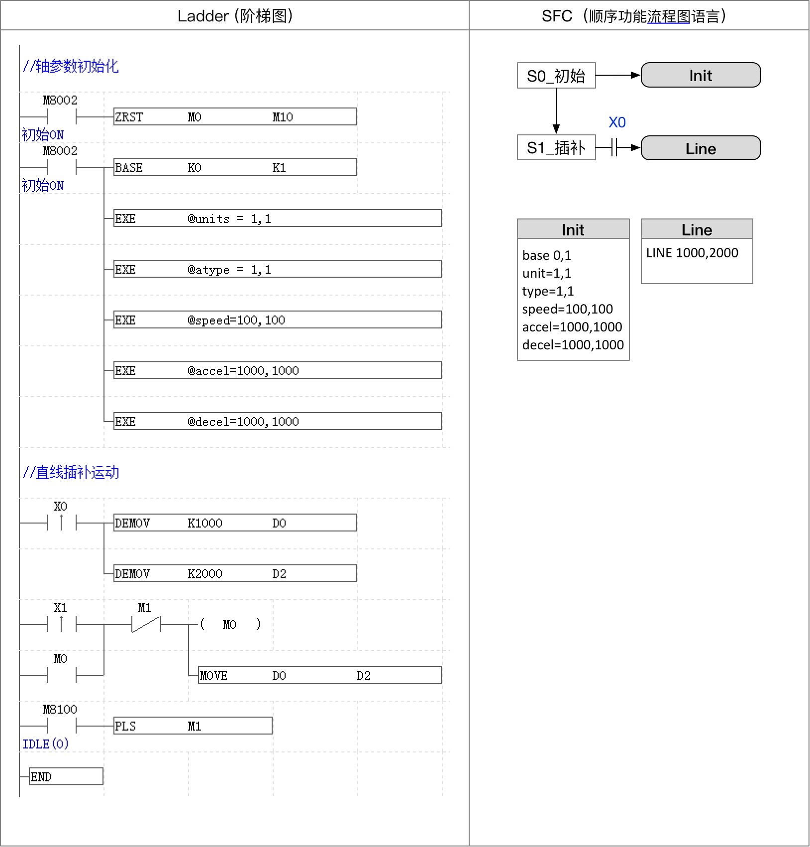 下面以2種語(yǔ)言實(shí)現兩軸直線(xiàn)插補運動(dòng)為例(相同動(dòng)作), 讓大家有個(gè)參考。