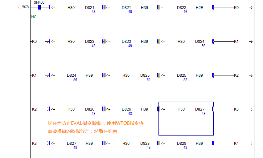 現在不知道什么原因造成存儲器(d1400)值與緩存(U11\G1536)值不一樣,然后會(huì )造成運算錯誤,現在為了防止運算錯誤發(fā)生,就對存儲器里的值進(jìn)行判斷,如果正常進(jìn)行EVAL運算,否則不運算,這樣的話(huà)目前沒(méi)有出現報錯,不知道后期會(huì )不會(huì ),退一步說(shuō),這個(gè)存儲器能不能批量約束,比如說(shuō) 對D1到D10里面的值 進(jìn)行單獨判斷,必須都有在0和9之間才能把D1到D9傳輸到D20到D29。
