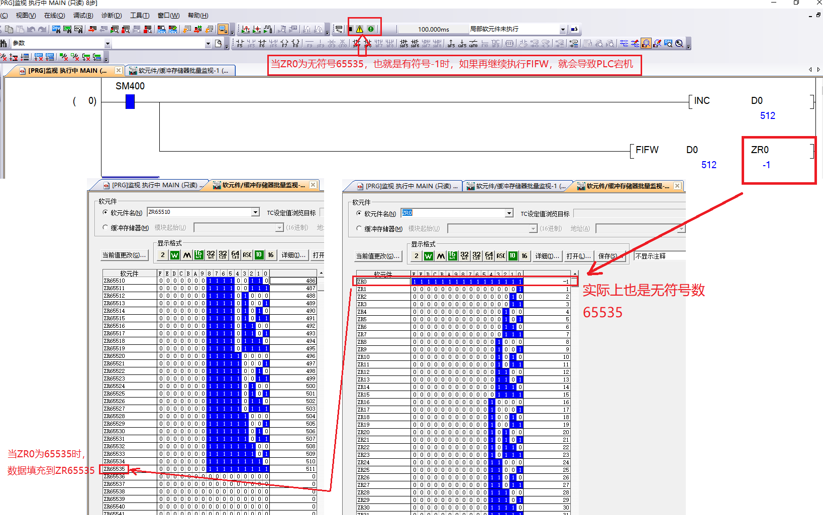 實(shí)驗后發(fā)現FIFW的第二個(gè)參數首地址比如R0最大只能到無(wú)符號數65535(也就是監控看到的有符號-1),當R0=65535時(shí)(-1),如果執行FIFW,就會(huì )導致PLC宕機。所以程序里面需要對R0做最大限制,比如當R0=-1時(shí),強制變回0。