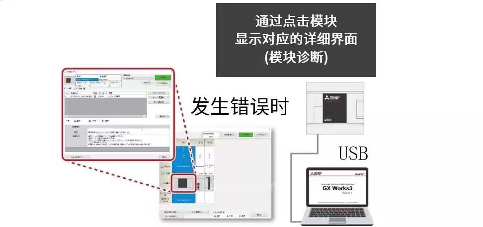 只需將計算機通過(guò)USB與CPU模塊連接,GX Works3即可開(kāi)始自動(dòng)診斷。顯示發(fā)生出錯模塊和出錯信息、處置方法?焖俅_認故障排除所需信息和步驟。(參照前文:只需連接USB,自動(dòng)開(kāi)始診斷)