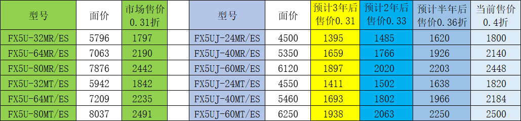 順利的話(huà),半年后市場(chǎng)上可能會(huì )出現0.36折的FX5UJ價(jià)格。這個(gè)價(jià)格只是稍低于現在FX5U的價(jià)格,吸引力還不夠大。