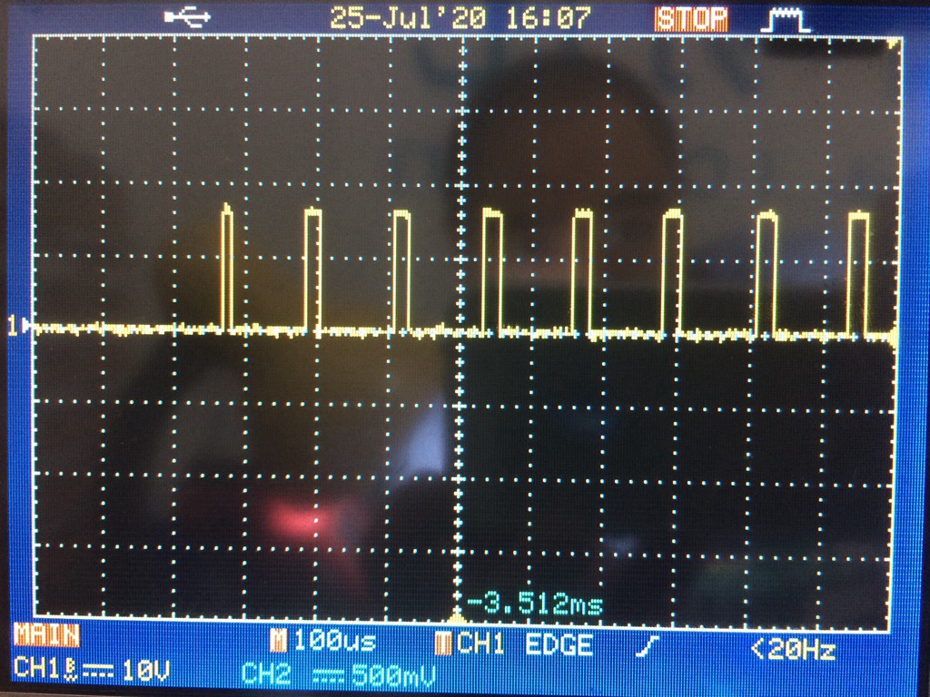 50Hz時(shí)一個(gè)周波。模擬示波器在示波器上圖片沒(méi)問(wèn)題,但手機照下來(lái)上半周比較暗,實(shí)際沒(méi)問(wèn)題。