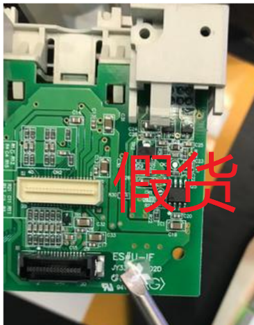 如今有些不法商家為了以假充真,用貼紙做了一個(gè)三菱標志粘在電路板上,如下圖: