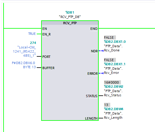 這里還想問(wèn)下RCV_PTP和Receive_P2P功能塊的區別,我現在用的是RCV_PTP,說(shuō)明里說(shuō)EN_R在上升沿啟用接收,但是我實(shí)際發(fā)現一直給TRUE也是可以接收的。我使用Receive_P2P就沒(méi)有接收成功過(guò)數據,這是什么原因?