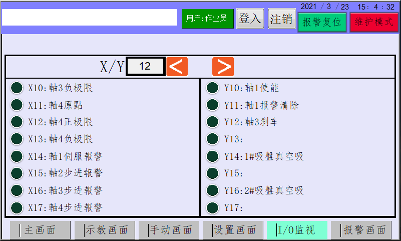 維倫HMI一個(gè)界面實(shí)現多I/O查看支持搜索功能,例如想找X12就再數據輸入控件中輸入12即可找到X12,Y12相關(guān)內容,很方便。