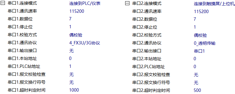 IGT-SER系列智能網(wǎng)關(guān)的串口1連接PLC,串口2連接觸摸屏,智能網(wǎng)關(guān)模塊的相關(guān)參數設置如下:
