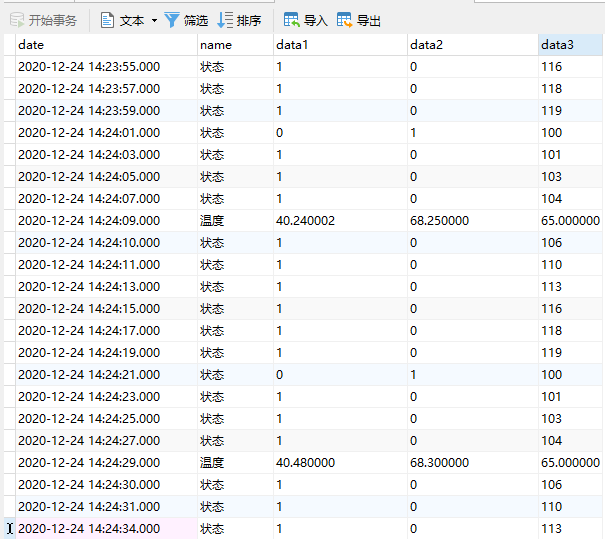 參數設置完成后通過(guò)‘參數’->‘參數寫(xiě)入到網(wǎng)關(guān)’將參數寫(xiě)入到網(wǎng)關(guān)模塊,‘工具’->‘重啟網(wǎng)關(guān)’,然后‘參數’->‘從網(wǎng)關(guān)讀取參數’,在狀態(tài)欄會(huì )顯示網(wǎng)關(guān)的狀態(tài);如果狀態(tài)正常,通過(guò)數據庫工具軟件Navicat連接數據庫,查看數據表中的數據,如下圖: