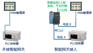 在PLC的通訊端口被觸摸屏占用時(shí),不用增加另外的通訊模塊,按照以下方式直接加入IGT-SER系列智能網(wǎng)關(guān)模塊,實(shí)現PLC與數據庫雙向通訊,具體原理如下: