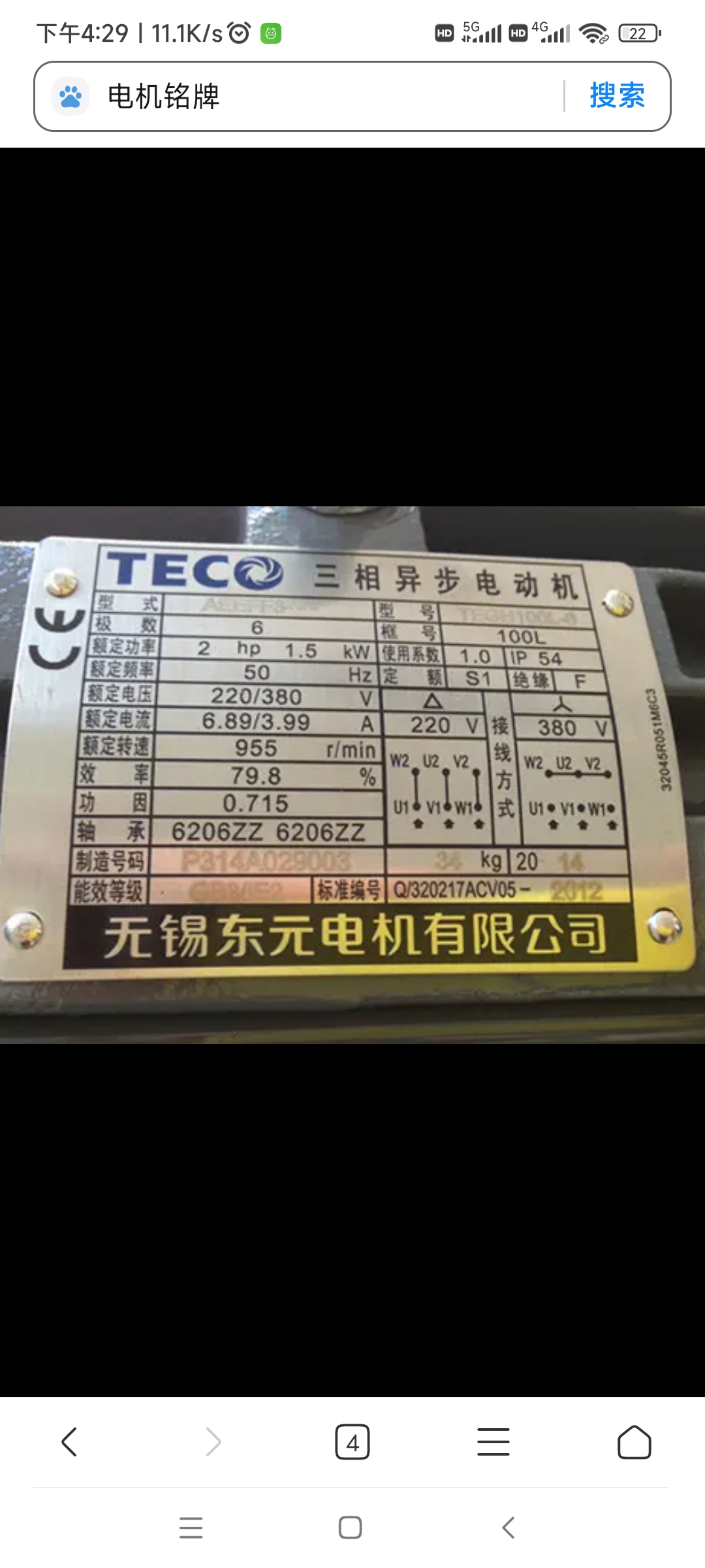 事實(shí)上,公司有三臺風(fēng)機7.5KW,標上寫(xiě)380V三角型接法。同時(shí)蓋子上有標星型和三角型的接線(xiàn)方式。
