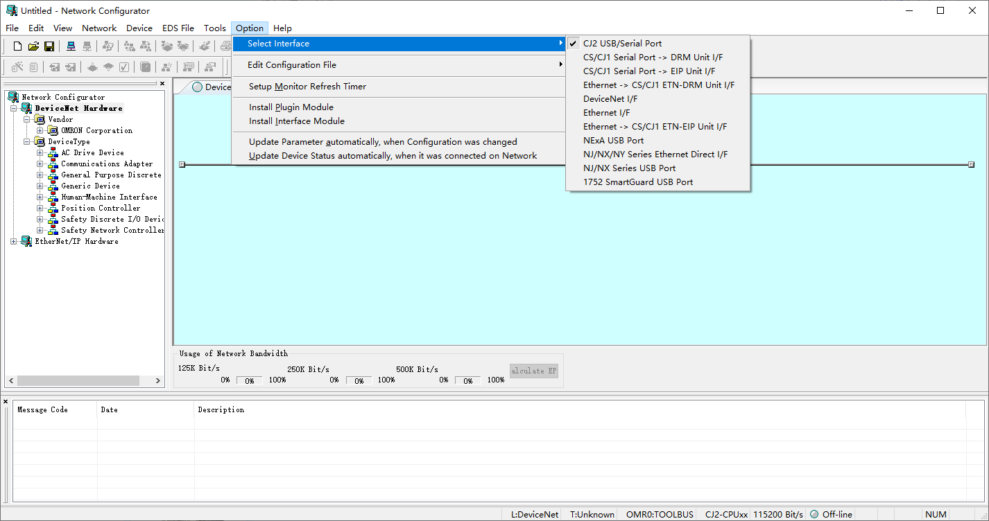菜單欄的【option - select interface】,選擇連接接口