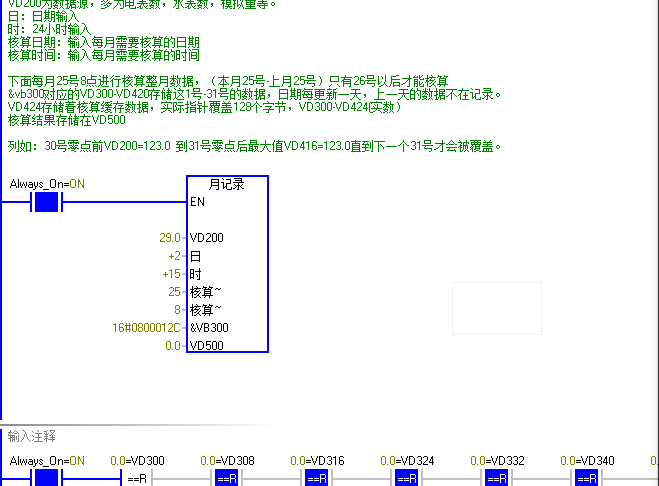 SMART電表,水表月記錄程序,讀取電表水表數,記錄1-31號數據。利用PLC內置時(shí)鐘每月自動(dòng)核算。