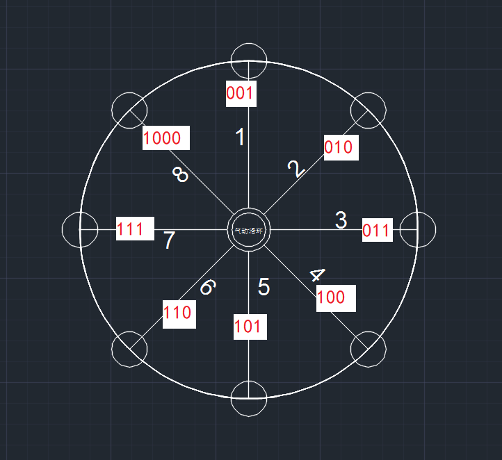 每個(gè)工位上卸料時(shí)要控制其對應的氣管,比如第一次一號工站控制1號氣管,轉盤(pán)轉動(dòng)一次后,一號工站上料時(shí),需要控制8號氣管了,再轉一次,要控制7號氣管。其他工位類(lèi)似這樣。