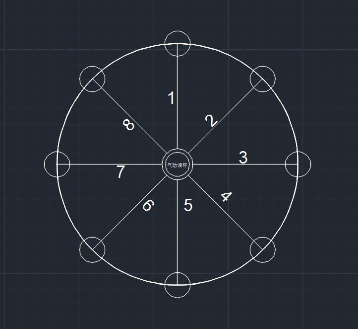 如圖 是一臺圓盤(pán)機,用凸輪分割器控制,8等分的。圓盤(pán)中間安裝了一個(gè)8路的氣動(dòng)滑環(huán),剛開(kāi)始的時(shí)候,1號氣管對應一號工站.圓盤(pán)轉一個(gè)工位1號氣管對應二號工站了,如此這樣一直循環(huán).........