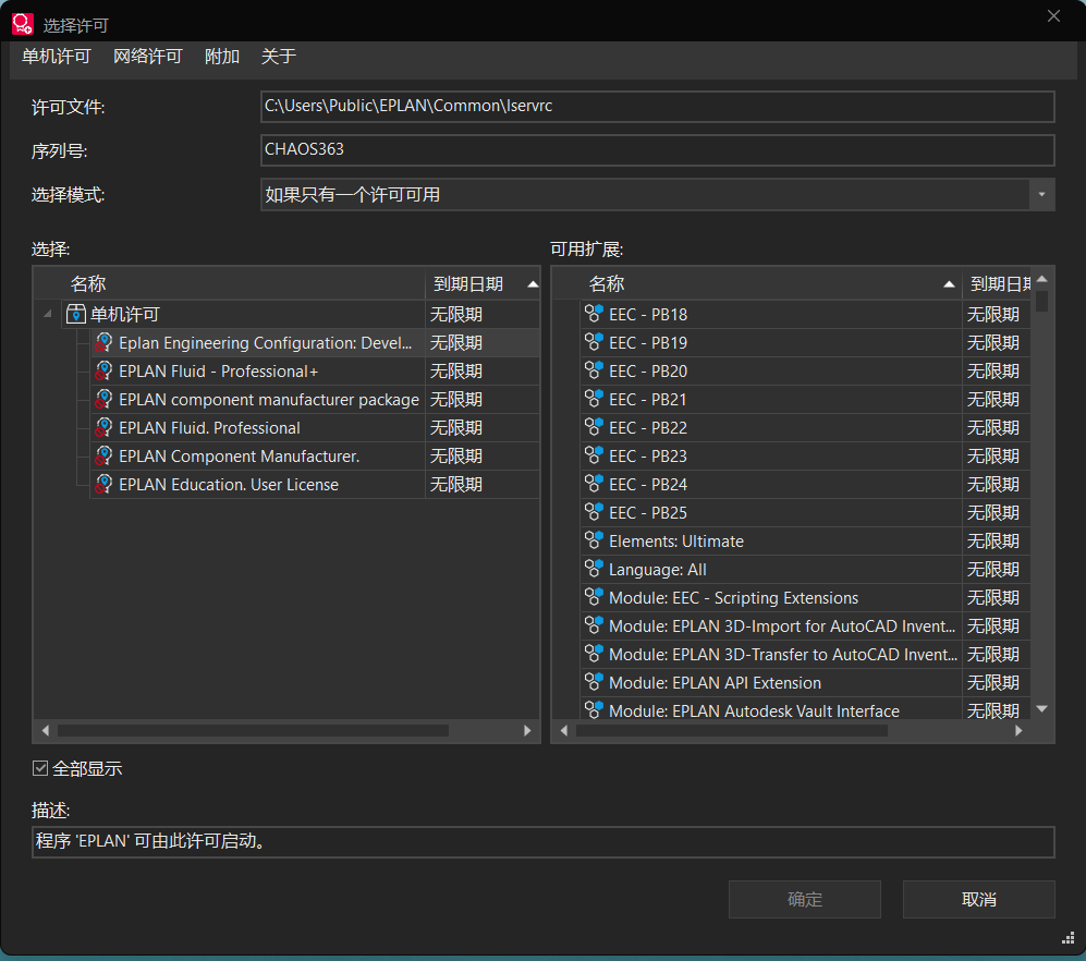Generate license using EPlanKeygen.exe: 1. Run EPlanKeygen.exe, click the "Lit Sync" button, and add the "EplanCommon. lit" file in the "C:\ProgramData\EPLAN\ELC" path 2. Click the "add" button on the bottom right side, search for "2024" in the pop-up dialog box, select all the search results, click "OK", and add EPLAN 2024 authorization |