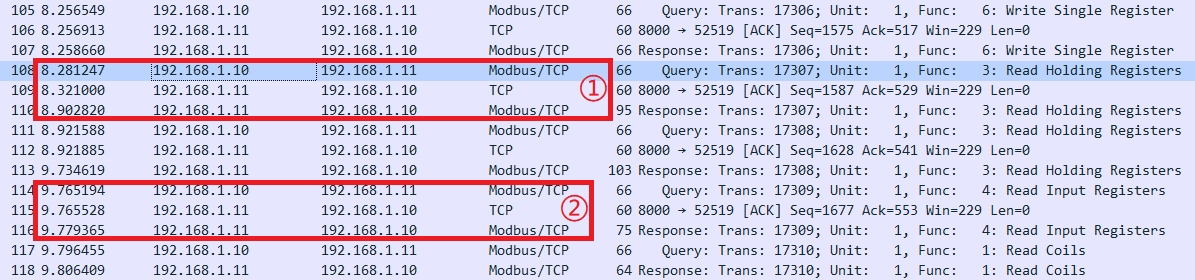 威綸通cmt2079x,用電腦通過(guò)modbus TCP讀取觸摸屏數據,如下圖,①處,響應很慢,要經(jīng)過(guò)0.6s才獲取數據,②那里就正常,求解