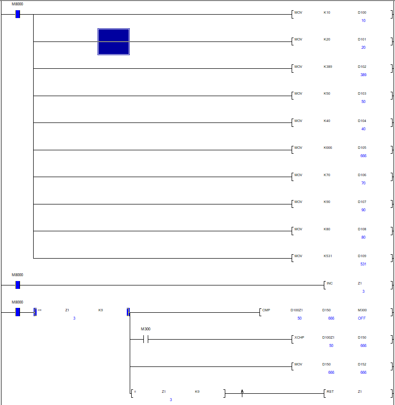 FX3U用比較指令求連續數據的最大值思路,同理也可以找出最小值。這里比較(d100---d109連續10個(gè)數)