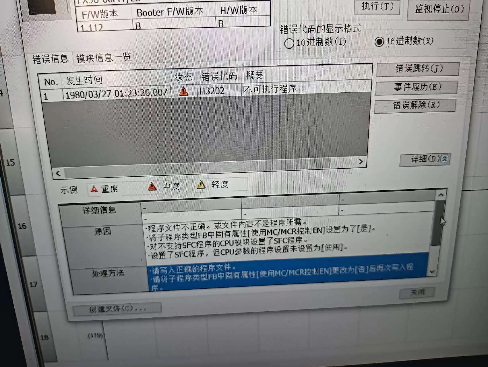 現場(chǎng)有一臺fx5u的plc.時(shí)不時(shí)就出現莫名其妙的停機。其他同事沒(méi)在意,以為是網(wǎng)線(xiàn)的問(wèn)題,導致通訊不上。后來(lái)?yè)Q幾次網(wǎng)線(xiàn),還是出現問(wèn)題。有一天出現了停機。就拿電腦過(guò)去監控一下。經(jīng)過(guò)診斷,提示意思說(shuō)不支持mc mcr功能,看功能塊也沒(méi)有調用sfc功能,后來(lái)打電話(huà)問(wèn)下三菱技術(shù),最終確認是固件版本低的問(wèn)題。找采購聯(lián)系代理,代理發(fā)過(guò)來(lái)一個(gè)固件升級包。