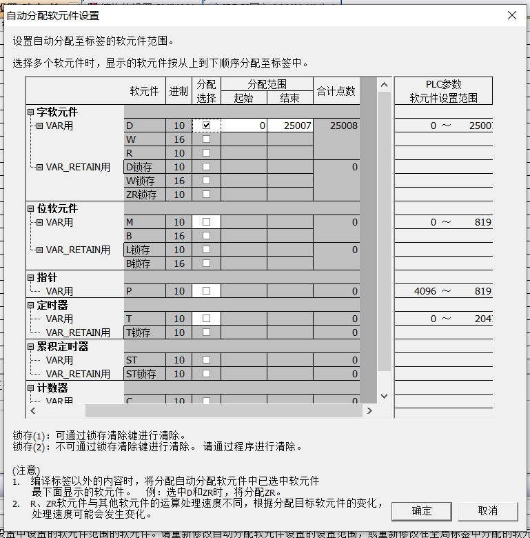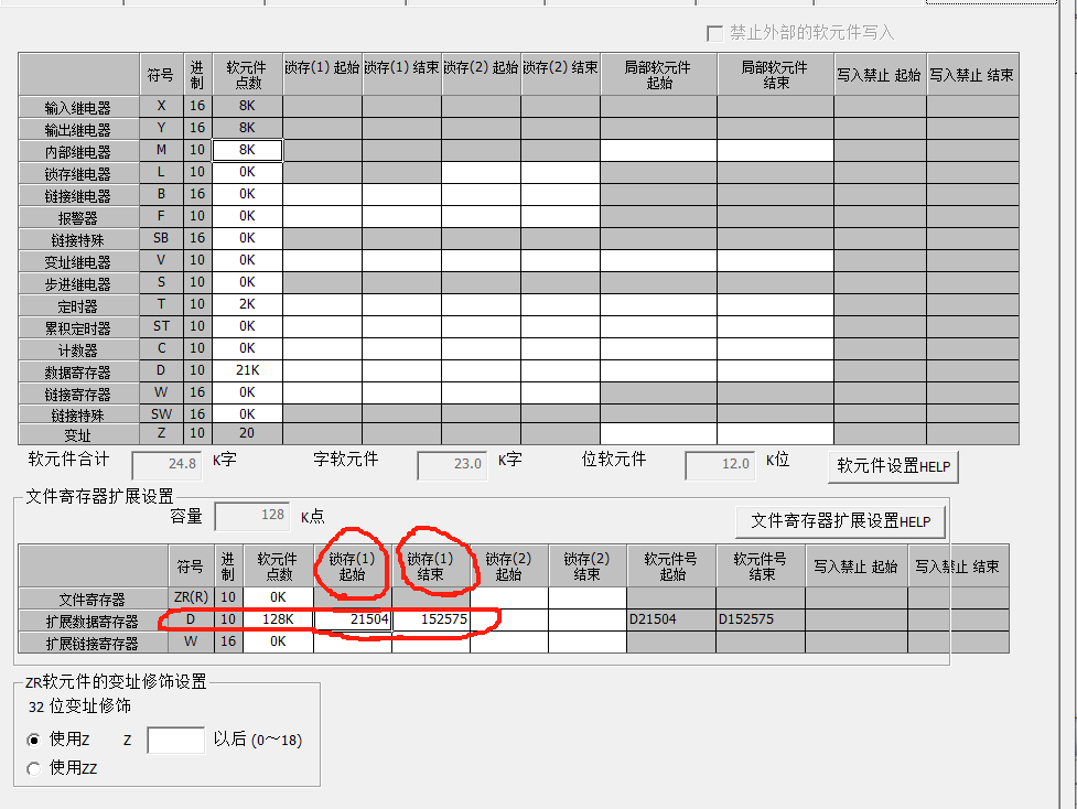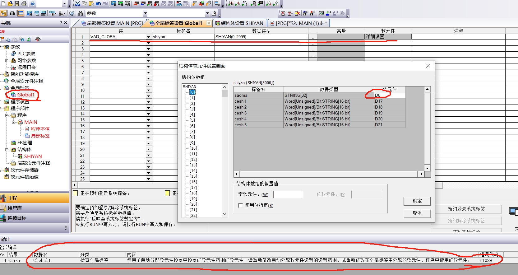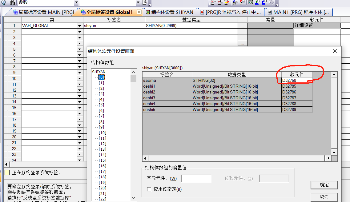 我新建一個(gè)結構體,里邊包括一些數據類(lèi)型。然后在全局標簽里以結構體類(lèi)型,建一個(gè)數組,元素數3000。軟元件設置和自動(dòng)分配軟元件都設置了 總是提示范圍不足。請問(wèn)我是沒(méi)設置對還是哪里有問(wèn)題?