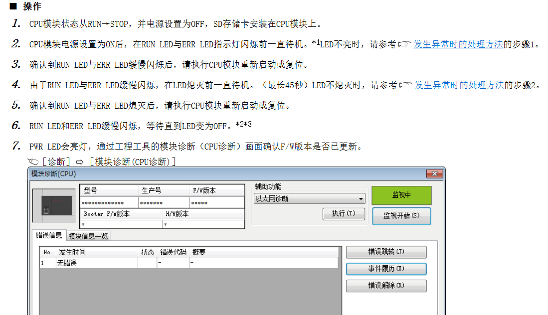 ![]() FX5U固件更新,手動(dòng)插SD卡更新步驟,請自行選擇,后果自負哦。 第1步,先解壓fx5ucpu_1310,找到$MELPRJ$文件夾,放在SD卡的子目錄(這一步需要注意,不要搞錯了) 第2步,斷電PLC,把RUN變STOP,插入SD卡后重新上電(不要RUN) 第3步,上電后,P.RUN和ERR閃爍30S,直到不閃爍后斷電 第4步,再次上電,P.RUN和ERR不閃爍后斷電(重復兩次) 第5步,把卡拿出,把STOP切換到RUN,重新上電完成 注:三菱技術(shù)員說(shuō)固件更新不會(huì )清除程序,但是自己還需要先備份再說(shuō)。 [ 此帖被夢(mèng)雨天涯在2025-03-20 13:14重新編輯 ] |