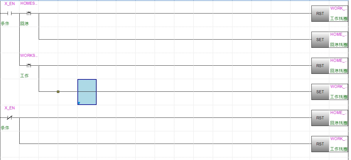 感謝指點(diǎn)問(wèn)題已經(jīng)找到了,是我的另外一個(gè)功能塊沒(méi)處理好關(guān)于你的這個(gè)建議,情況是這樣的,可能是我的程序問(wèn)題,就是如果把這句去掉,就會(huì )出現一個(gè)問(wèn)題。手動(dòng)狀態(tài)時(shí)候如果FB塊里的工作線(xiàn)圈是置位狀態(tài),在打到自動(dòng)運行的時(shí)候FB塊里的工作線(xiàn)圈狀態(tài)不會(huì )復位,然后氣缸狀態(tài)就會(huì )被影響所以我才加了一個(gè)條件不滿(mǎn)足就復位塊里的線(xiàn)圈因為剛學(xué)習用功能塊,還不熟練,我在想是不是功能塊里要盡量避免用SET/RST