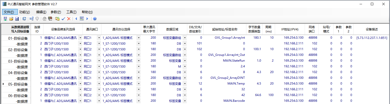 PLC內不用編程,實(shí)現西門(mén)子1200的PLC跟倍福PLC標簽方式通訊,采用IGT-DSER智能網(wǎng)關(guān),它支持多個(gè)品牌的PLC之間多對多通訊,最多8000個(gè)字節的數據交互量,相關(guān)參數在一個(gè)頁(yè)面內配置,方便直觀(guān)。通過(guò)智能網(wǎng)關(guān)的參數軟件(在附件中)選擇PLC之間通訊的功能,下面是配置截圖: