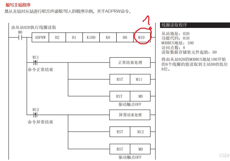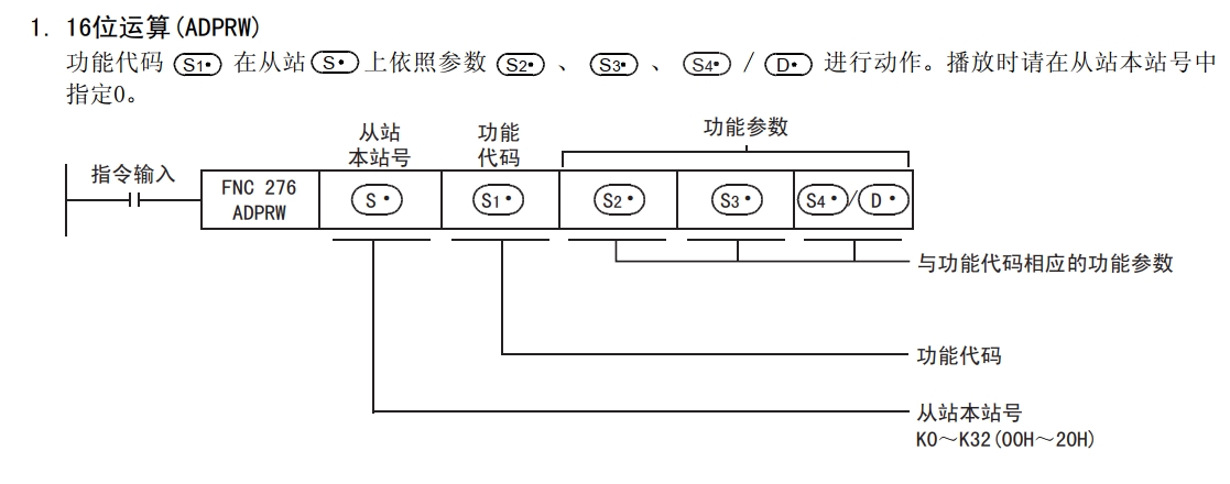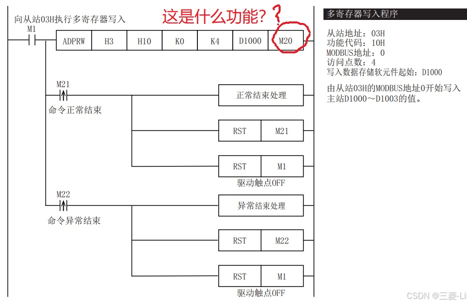 最近在學(xué)習FX3U的Modbus功能,突然看到其它大神的一段程序示例,不明白ADPRW指令的最后一個(gè)數據D是什么功能,