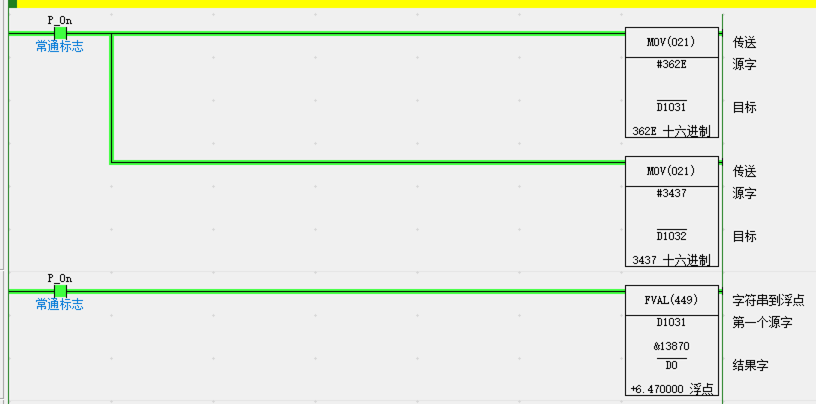 大佬們,接觸了半年的歐姆龍cp系列plc,想問(wèn)一下下面鏈接里面的圖,其中D1031和D1032,16進(jìn)制的值為362E,3437,用ASCLL碼轉換為就是6.47,就是這個(gè)6.47是兩個(gè)地址,能用什么辦法把它變?yōu)橐粋(gè)地址,或者讓一個(gè)地址直接顯示為浮點(diǎn)數6.47嗎