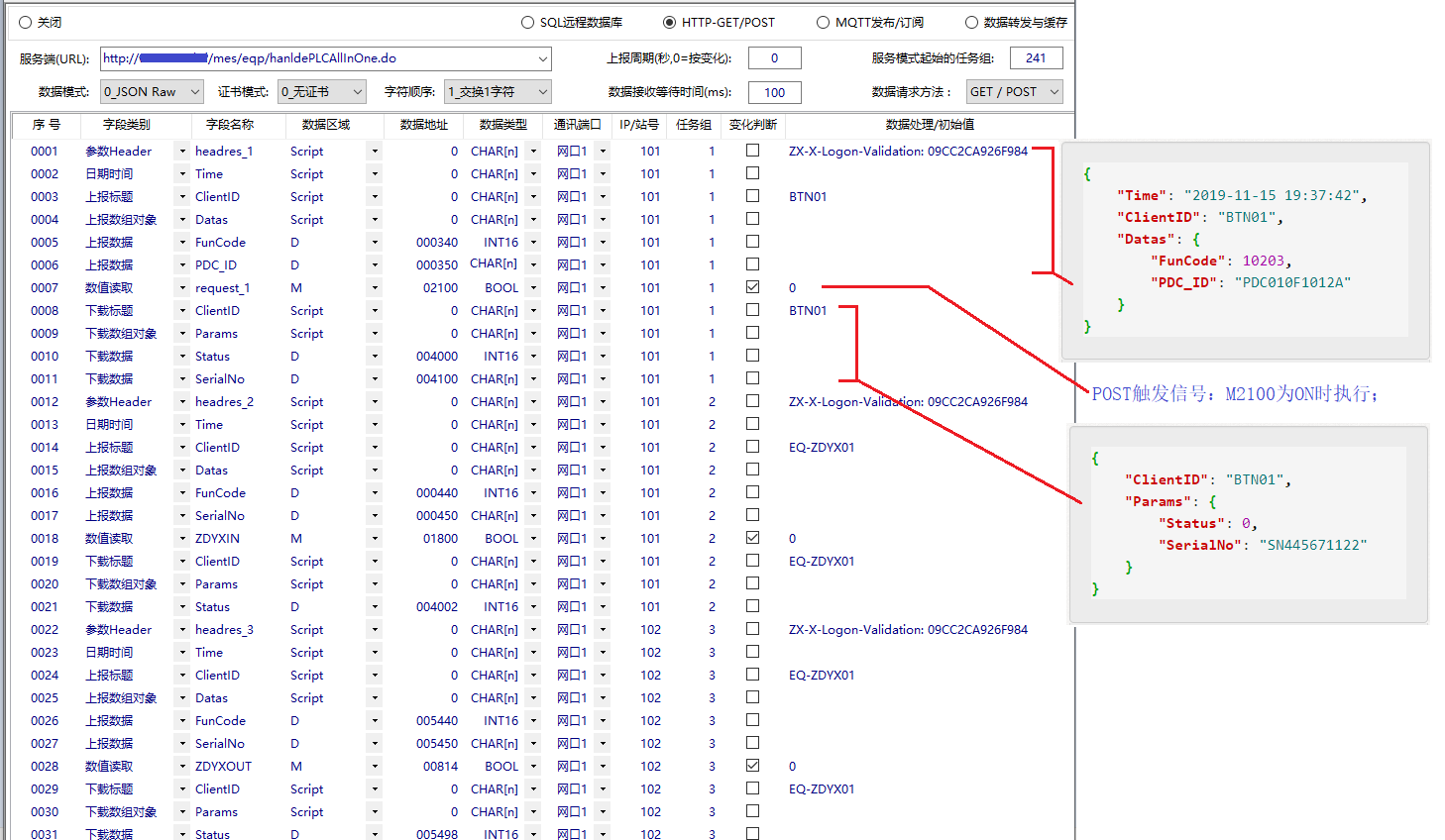 三菱Q系列的PLC,采用觸發(fā)模式,分多組提交POST請求,服務(wù)端返回的數據需要解析后寫(xiě)入到PLC寄存器。運行網(wǎng)關(guān)的參數配置軟件(在附件中),按照用戶(hù)手冊配置好網(wǎng)關(guān)的網(wǎng)絡(luò )通訊后,即可進(jìn)行數據配置測試,配置表與JSON的對應關(guān)系如下: