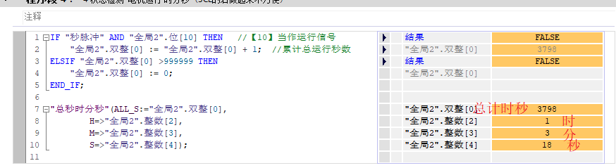 它的原理非常簡(jiǎn)單,用一個(gè)雙字類(lèi)型數據來(lái)接收電機運行的累計總秒數。然后稍加運算把它拆分成時(shí)分秒顯示更直觀(guān)一些。最后注意加上自動(dòng)清零或者人工清零運行時(shí)間,防止出現長(cháng)時(shí)間的數據溢出錯誤。