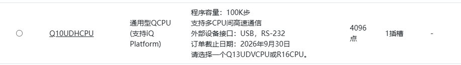 不建議CPU使用Q10UDH+以太網(wǎng)模塊替換:如果原CPU的網(wǎng)口使用了部分通訊的話(huà),你替換程序要做相應的修改,主要以太網(wǎng)模塊QJ71E71-100和本體網(wǎng)口部分功能有差異;還有就是兩個(gè)PLC的軟元件地址規劃也有部分差異,原程序用到了差異部分的話(huà),你處理起來(lái)會(huì )比較麻煩,。建議使用Q13UDV替換。
