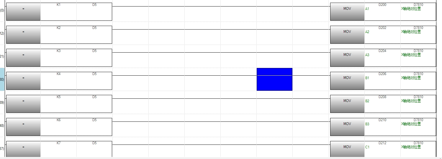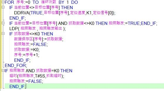 伺服絕對位程序, 移動(dòng)到A 點(diǎn) 觸發(fā)一次相機 然后自動(dòng)運行到B 點(diǎn)再次觸發(fā)相機抓取數據保存到PLC的寄存器里面 這樣重復一共要 跑9 個(gè)點(diǎn) 然后抓取,想請問(wèn)這樣的控制程序,應該怎么來(lái)寫(xiě)?我現在用的寄存器賦值,每次定位到了以后標記位INC+1 然后跳轉到相機SOCKET程序段進(jìn)行抓取,抓取完成后通過(guò)計時(shí)器T1復位 賦值定位位置 繼續跑 這樣輪詢(xún) 還有別的什么方法么???