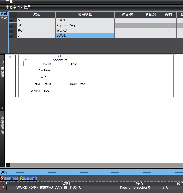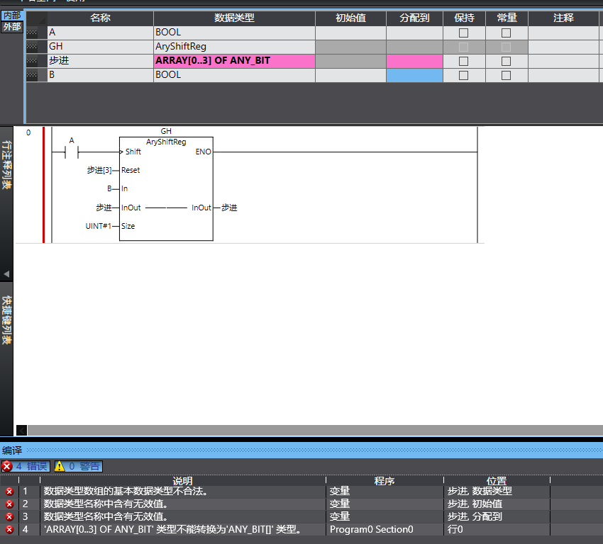 ARRAY[0..3] OF BOOL我使用的這個(gè)報警,看說(shuō)明書(shū)可以使用布爾跟位列類(lèi)型的,我使用BOOL或者WORD都不可以