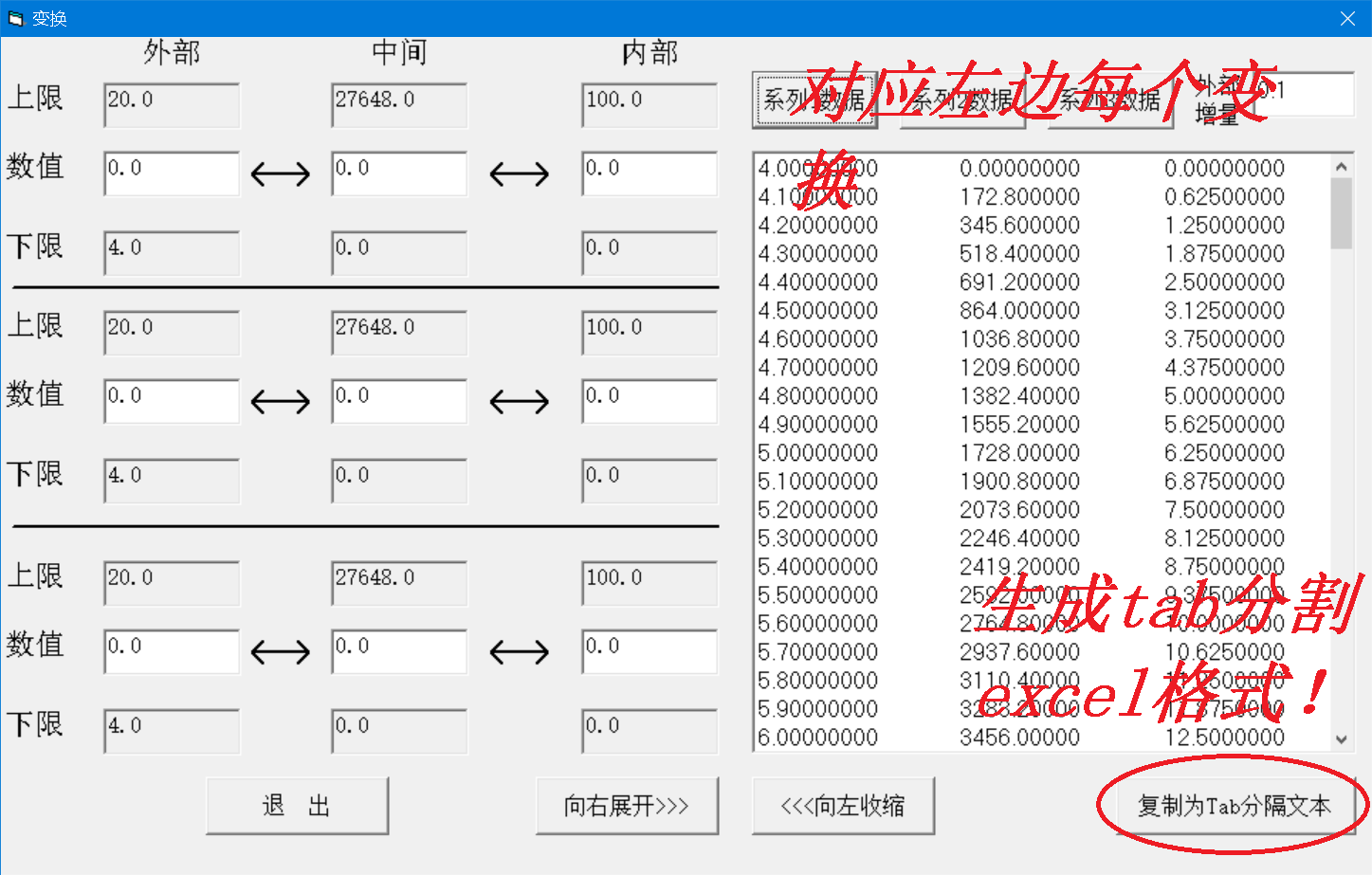 你在外部數值里輸入10(默認對應的是10mA),在中間的數值里就會(huì )自動(dòng)顯示出10mA對應的中間數值(就是模擬量模塊讀出的數值,對于西門(mén)子PLC來(lái)說(shuō)就是0-27648之間的數值),在內部的數值里顯示的是換算后的工程數值,例如壓力、流量等