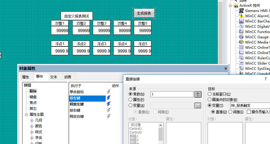 第二步,簡(jiǎn)單搭建一個(gè)測試畫(huà)面。按鈕來(lái)觸發(fā)另存報表功能,需要每小時(shí)或者每天生成報表的只需要定時(shí)把這個(gè)布爾變量觸發(fā)一次就行。