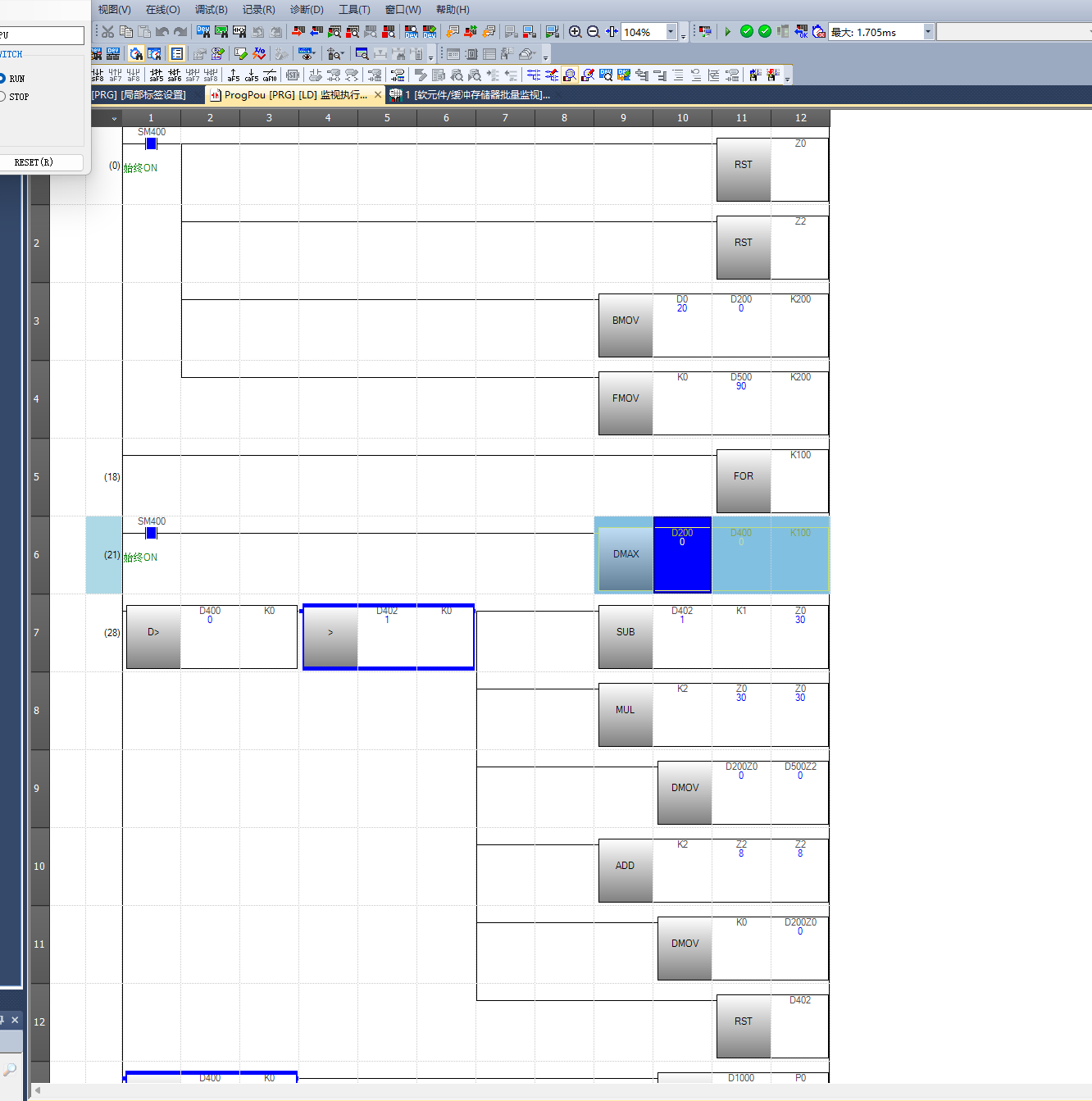 100個(gè)32位整形從大到小排序,實(shí)時(shí)執行時(shí)仿真掃描周期5.6ms(在我電腦上)