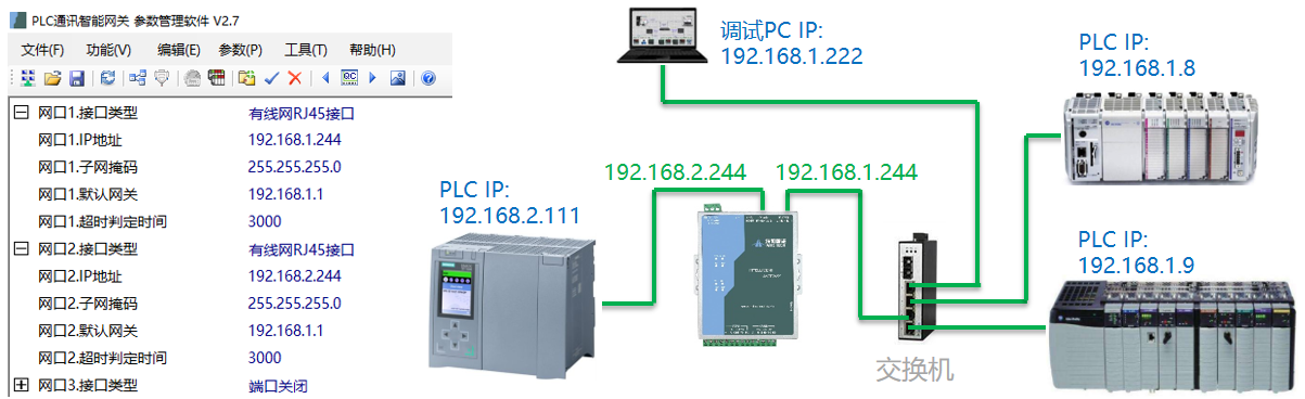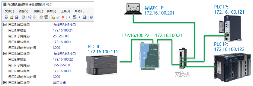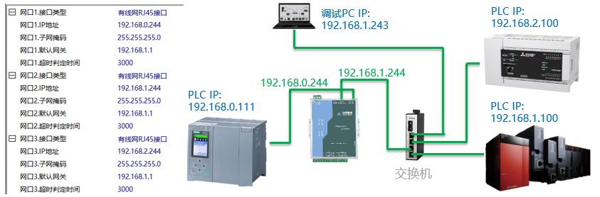 三、多網(wǎng)段的PLC之間通訊: IGT-DSER智能網(wǎng)關(guān)的兩個(gè)網(wǎng)口設置為不同的網(wǎng)段,同時(shí)開(kāi)啟網(wǎng)口3設置為第三網(wǎng)段,該智能網(wǎng)關(guān)沒(méi)有實(shí)際的物理網(wǎng)口3,自動(dòng)將IP綁定到物理網(wǎng)口2,作為網(wǎng)口2的第二IP。