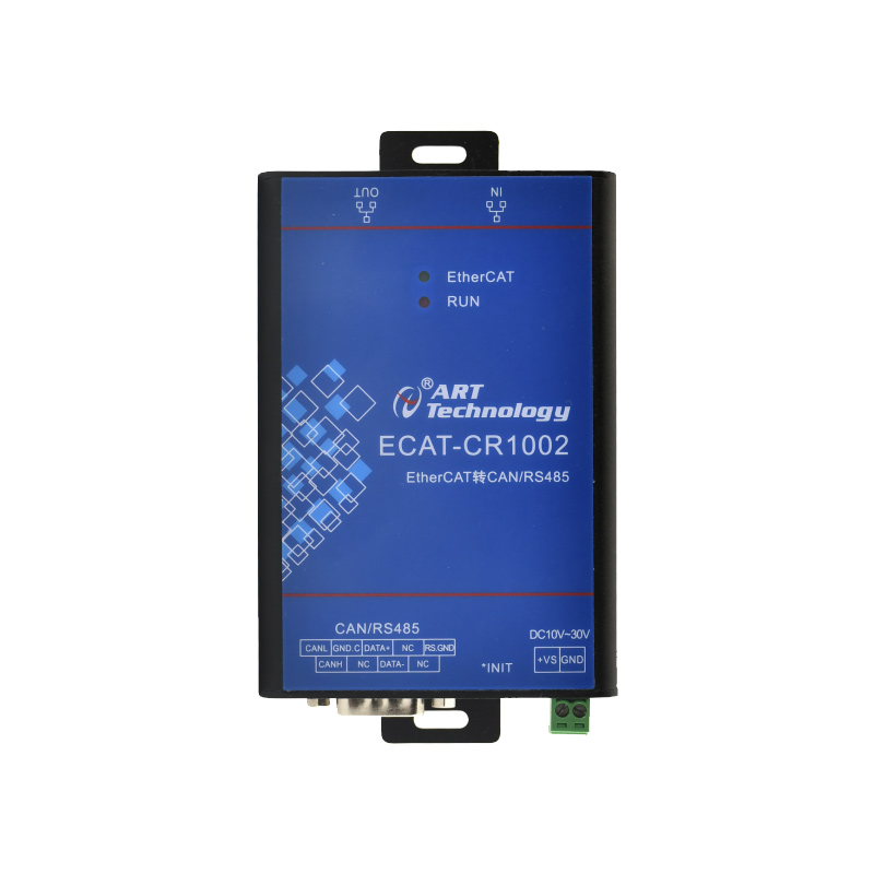 ECAT-CR1002 為一款 EtherCAT 轉 CAN/RS485 模塊。提供 2 路 EtherCAT 總線(xiàn)接口,一進(jìn)一出。一路 CAN 總線(xiàn)接口,實(shí)現 EtherCAT 與 CAN 的相互轉換,一路 RS485 總線(xiàn)接口,實(shí)現 MODBUS主機功能。