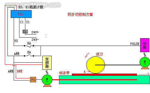 變頻拖動(dòng)電機帶傳送帶向右移動(dòng),傳送帶上有需要定長(cháng)切的材料,電機后加編碼器,編碼器的A/B相脈沖接V系列變頻器構成閉環(huán)矢量控制,保證電機特性曲線(xiàn)的硬度,另外將A/B相脈沖接進(jìn)PLC高速計數。同時(shí)將A相脈沖接PLC的Y1觸點(diǎn)連接的繼電器的常開(kāi)觸點(diǎn)。PLC的脈沖輸出觸點(diǎn)Y0接繼電器的常閉觸點(diǎn)。工藝要求如下所述:變頻拖動(dòng)傳送帶輸送要被裁切的材料,伺服拖動(dòng)滾刀連續運轉,當到達設定的要裁切的長(cháng)度時(shí),正好保證滾刀運行至最低點(diǎn),將材料切斷。