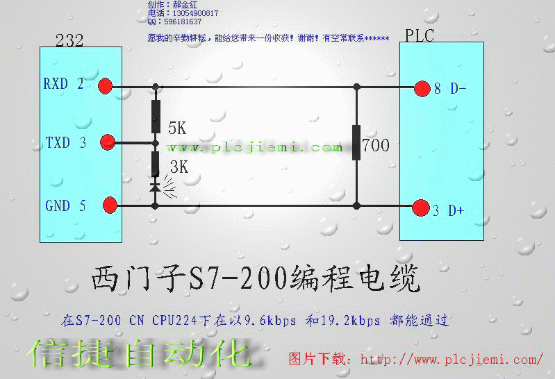 我看了網(wǎng)友的回復竟然說(shuō)不敢用!傷心...........本在此鄭重聲明:此圖為本人得意之作,現已使用2年,以人格擔保絕對好用,絕對沒(méi)有問(wèn)題。非但如此而且超出正版PPI電纜功能,如果圖中的二極管使用發(fā)光二極管的話(huà),通訊時(shí)燈在閃爍,這可是西門(mén)子的PPI電纜所沒(méi)有的功能噢!